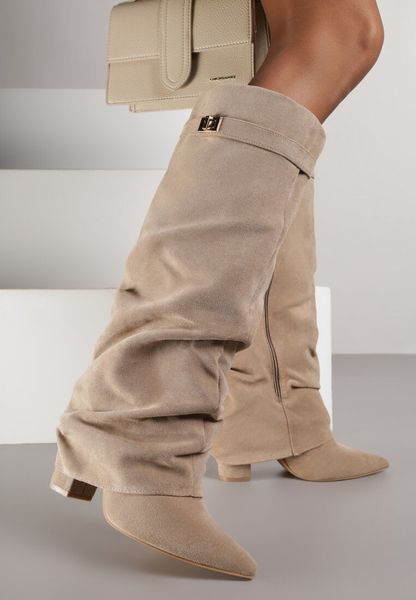 Ciemnobeżowe Marszczone Kozaki na Słupkowym Obcasie z Wywiniętą Cholewką Runella