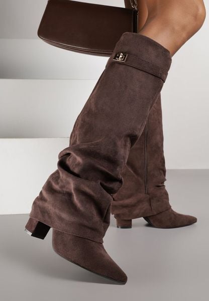 Brązowe Kozaki na Słupku z Marszczoną Cholewką Imitującą Nogawkę Rittia