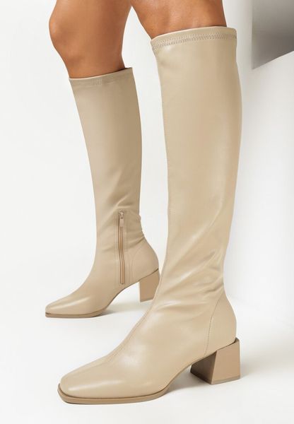 Ciemnobeżowe Kozaki na Obcasie z Dopasowaną Cholewką Fagwona