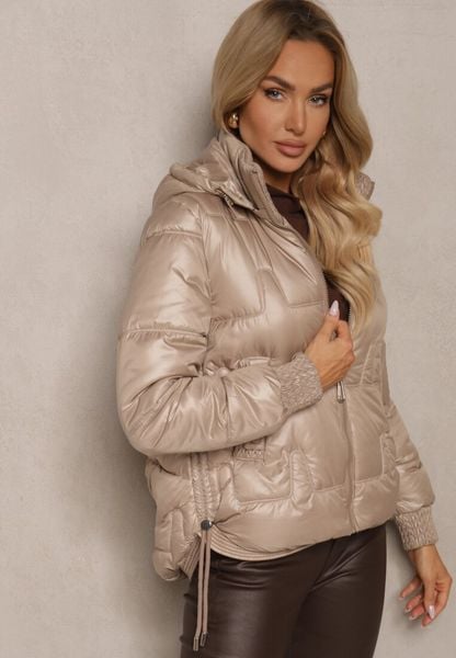 Ciemnobeżowa Pikowana Kurtka z Materiałowym Kapturem i Kieszeniami Ravalynne