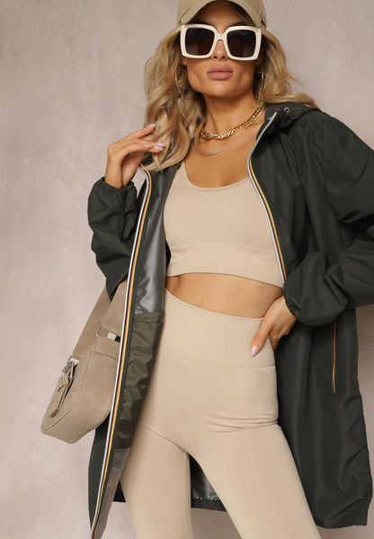 Ciemnozielona Kurtka Długa Wiatrówka z Nieodpinanym Kapturem Liodesa