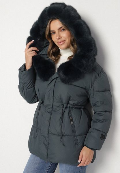 Ciemnozielona Kurtka z Pikowanymi Przeszyciami i Kapturem z Futerkiem Galiadia