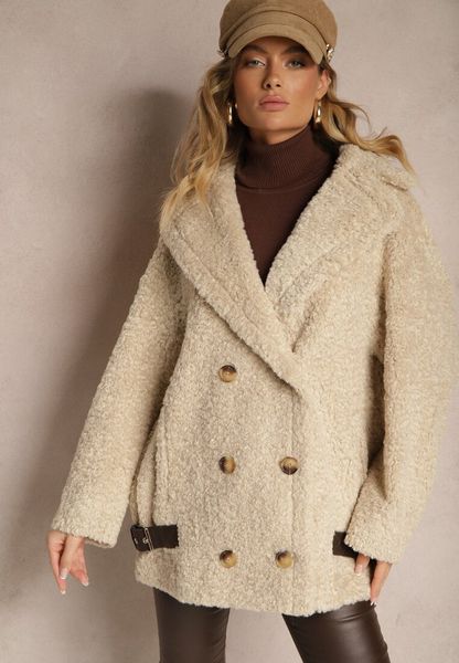 Jasnobeżowa Futrzana Kurtka Typu Baranek z Ozdobnymi Paskami i Dwurzędowym Zapięciem Nikira