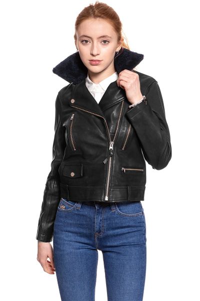 Damska kurtka skórzana typu ramoneska w czarnym kolorze. Charakteryzuje ją dopasowany krój oraz odpinany, granatowy kołnierz. W pełni wykonana z miękkiej, owczej skóry. Posiada dwie praktyczne kieszonki.