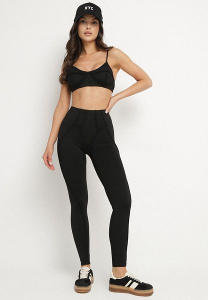Czarny Komplet Sportowy z Ozdobnymi Przeszyciami Legginsy i Top na Ramiączkach Filinella