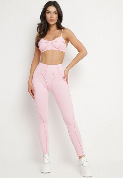 Jasnoróżowy Komplet Sportowy z Ozdobnymi Przeszyciami Legginsy i Top na Ramiączkach Filinella