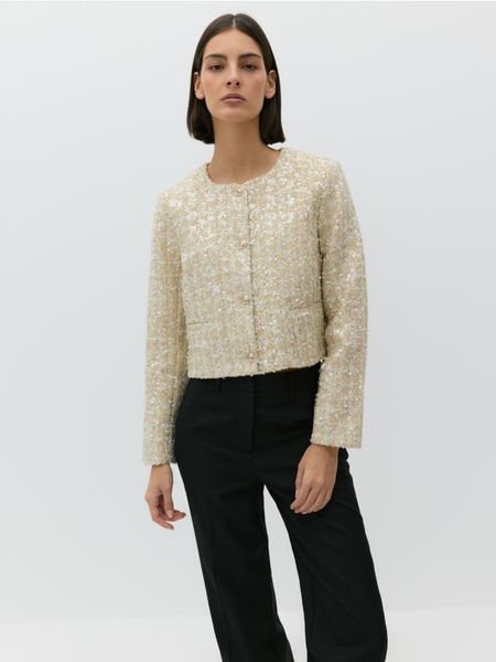 Marynarka o pudełkowym fasonie, wykonana z tkaniny.