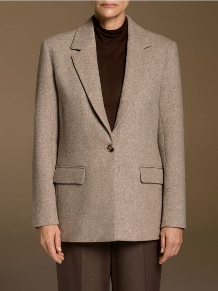 Marynarka o klasycznym kroju, wykonana z tkaniny z wełną.