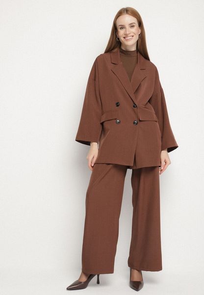 Brązowy Komplet Garniturowy Dwurzędowa Marynarka Oversize i Szerokie Spodnie Tevalda