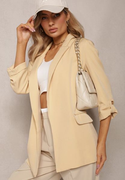 Beżowa Niezapinana Marynarka z Rękawami 3/4 i Kieszeniami na Klapy Farsana