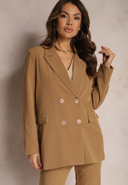 Beżowa Dwurzędowa Marynarka na Guziki z Poduszkami w Ramionach Elennia