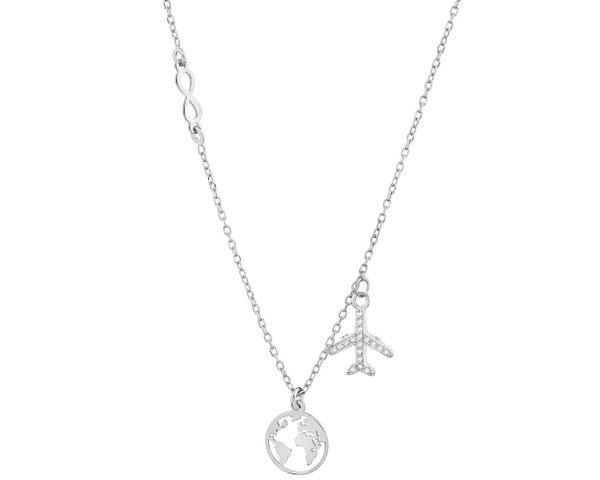 Naszyjnik srebrny z cyrkoniami – samolot, kula ziemska – AP536-6491. Srebro rodowane