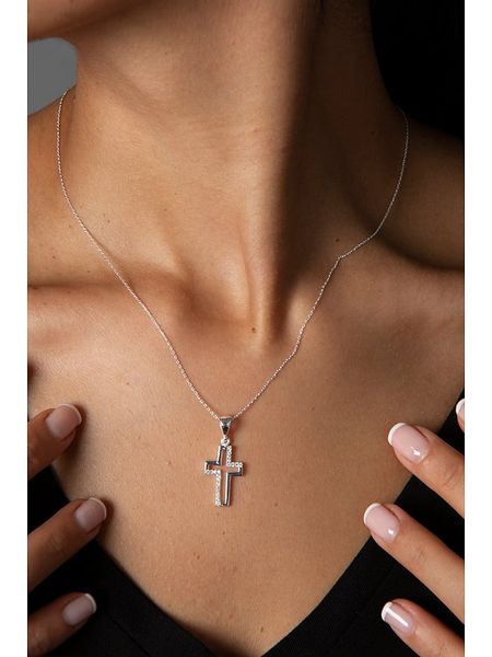 – materiał: srebro Sterling próby 925- powłoka: rodowanie- typ łańcuszka: ankier- zapięcie: karabińczyk- rodzaj kamienia: cyrkonia- kolor kamienia: bezbarwny- kształt zawieszki: krzyż- regulacja długości: tak- opakowanie: pudełko Wskazówka: Zdjęcie produktu w powiększeniu.