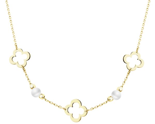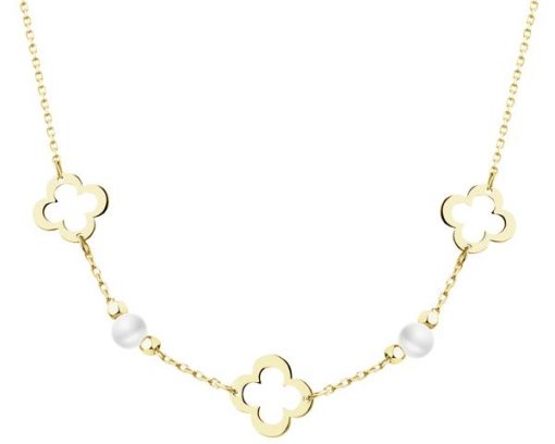 Złoty naszyjnik z perłami i cyrkonią – koniczyny – AP543-5544. Żółte złoto