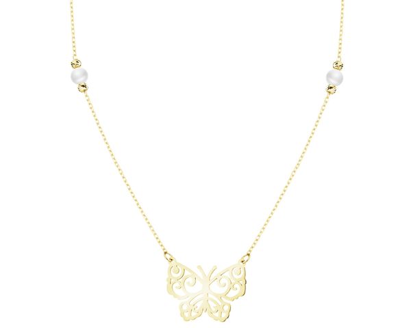 Złoty naszyjnik z perłami i cyrkonią – motyl – AP543-7195. Żółte złoto