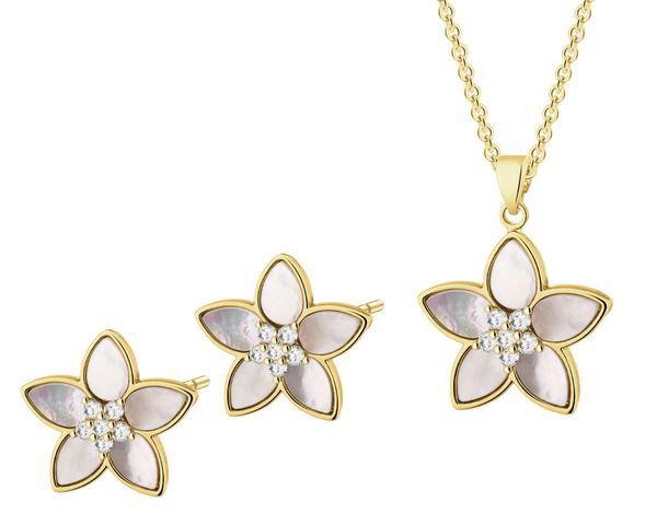 Kolczyki i naszyjnik z mosiądzu pozłacane z cyrkoniami i masą perłową – komplet – kwiaty – KPL544-2538. Mosiądz pozłacany