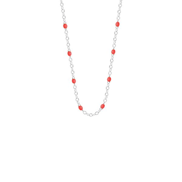 Posrebrzany naszyjnik z czerwoną emalią o długości 42 cm + 5 cm przedłużki. Naszyjnik wykonany jest ze stali szlachetnej pokrytej srebrem próby 925.