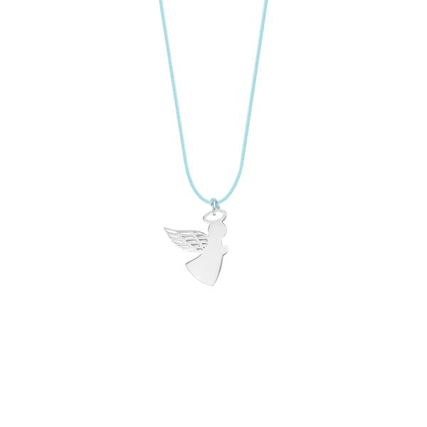Naszyjnik z posrebrzanym Aniołkiem z ażurowym skrzydłem o wielkości 1,5 cm, na cienkim błękitnym sznurku. Aniołek to opiekun oraz wierny przyjaciel. Daje poczucie bezpieczeństwa oraz symbolizuje troskę i piękno. Osobisty grawerunek doda wyjątkowości i pomoże wyrazić uczucia. Zawieszka wykonana jest ze stali szlachetnej pokrytej srebrem próby 925.