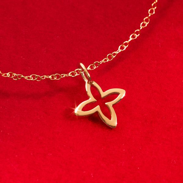 Naszyjnik ze złotą ażurową lilią o wielkości 1 cm na złotym łańcuszku Nitka. Lilia jest symbolem naturalnego piękna i odrodzenia. Łańcuszek i element wykonane ze złota próby 585. Waga:Zawieszka: 0,6 gram.Łańcuszek 40 cm: 0,74 gram.Łańcuszek 50 cm: 0,87 gram.