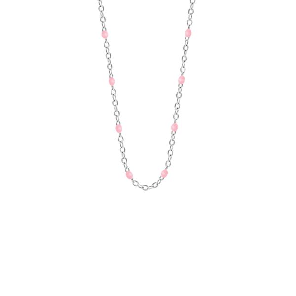 Posrebrzany naszyjnik z różową emalią o długości 42 cm + 5 cm przedłużki. Naszyjnik wykonany jest ze stali szlachetnej pokrytej srebrem próby 925, emaliowany.
