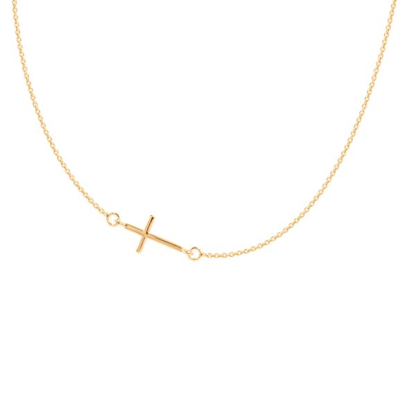 Naszyjnik z pozłacanym krzyżykiem o wielkości 1,5 cm na łańcuszku. Krzyż to symbol życia i sił witalnych. Całkowita długość naszyjnika: ok. 40 cm Naszyjnik wykonany z mosiądzu pozłacanego 18-karatowym złotem.
