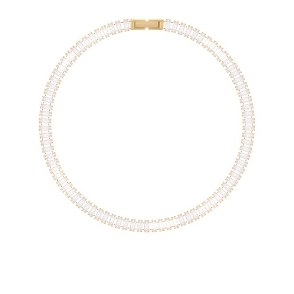 Naszyjnik kolia z białymi cyrkoniami o długości 36 cm + 3 cm przedłużki.Naszyjnik wykonany ze stali pozłacanej 18-karatowym złotem, zdobiony cyrkoniami.