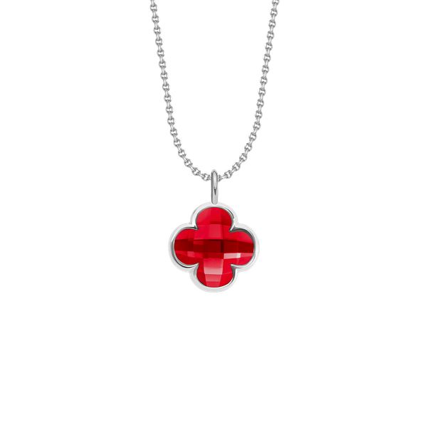 Naszyjnik z zawieszką w kształcie koniczyny z czerwonym szkłem kryształowym na cienkim klasycznym łańcuszku. Osobisty grawerunek uczyni Twoją biżuterię niepowtarzalną. Wielkość zawieszki: 1 cm Zawieszka i łańcuszek wykonane są ze stali szlachetnej pokrytej srebrem próby 925.
