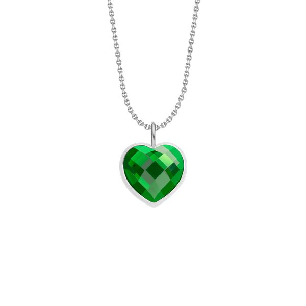 Naszyjnik z zawieszką w kształcie serca z zielonym szkłem kryształowym na cienkim klasycznym łańcuszku. Osobisty grawerunek uczyni Twoją biżuterię niepowtarzalną. Wielkość zawieszki: 1 cm Zawieszka i łańcuszek wykonane są ze stali szlachetnej pokrytej srebrem próby 925.