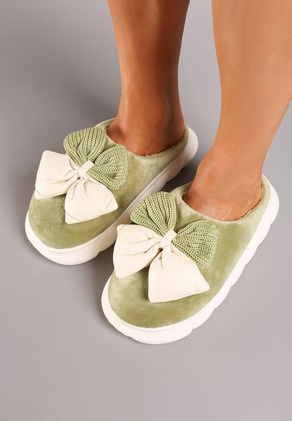 Zielone Kapcie na Płaskiej Podeszwie z Futerkiem i Kokardą Dezilaine