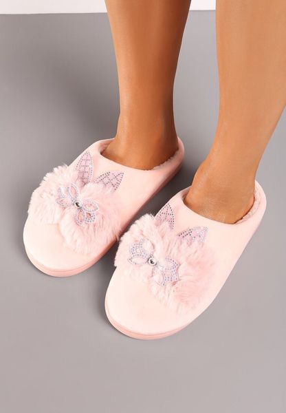 Różowe Płaskie Kapcie Ozdobione Futerkiem i Cyrkoniami Dezitana