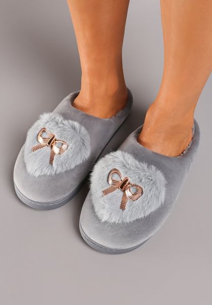 Szare Kapcie Wsuwane z Futerkiem Ozdobione Kokardą z Metalowymi Detalami Reaniara