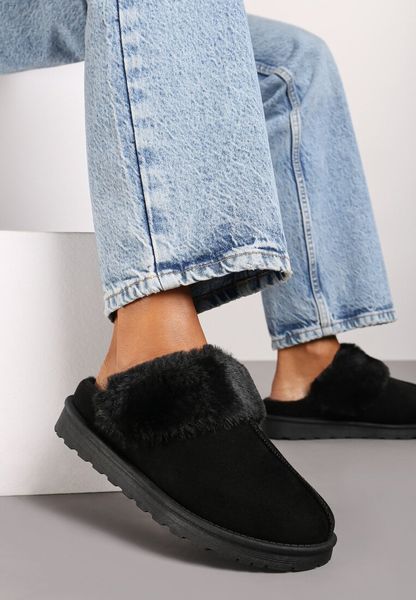 Czarne Płaskie Kapcie Ozdobione Futerkiem Avettria