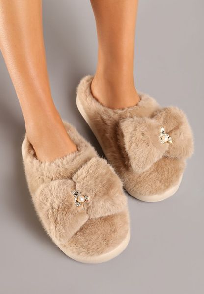 Ciemnobeżowe Kapcie z Futerka Ozdobione Kokardką i Biżuteryjnymi Misiem Mesida