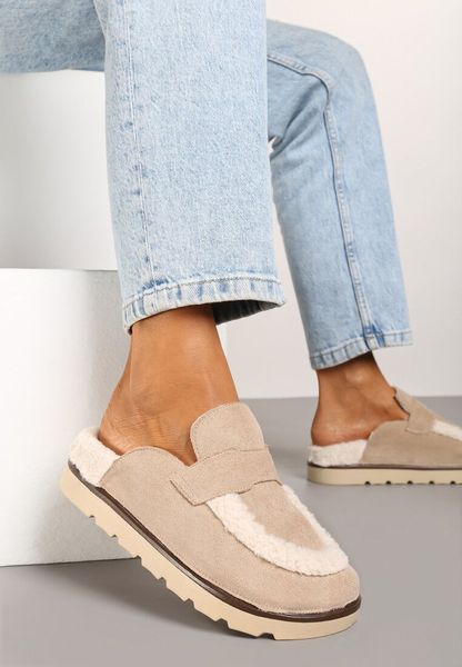 Ciemnobeżowe Kapcie na Płaskiej Podeszwie z Futerkiem i Paskiem Niaviera