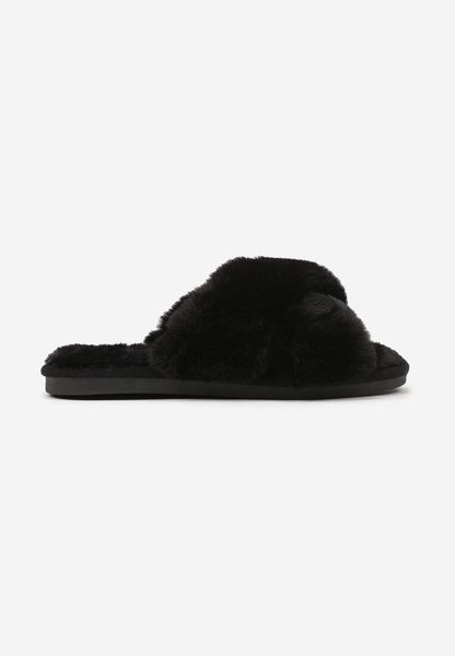 Czarne Kapcie Vices z Szerokimi Paskami Ozdobione Futerkiem Selenor