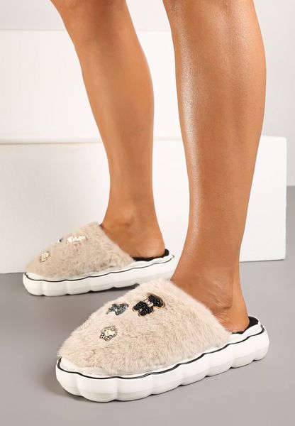 Ciemnobeżowe Wsuwane Kapcie z Futerkiem Ozdobione Metalowymi Aplikacjami Reandwenna