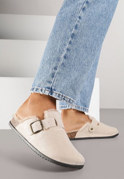 Beżowe Kapcie Typu Chodaki na Podeszwie z Korka Ozdobione Klamrą Alanelle