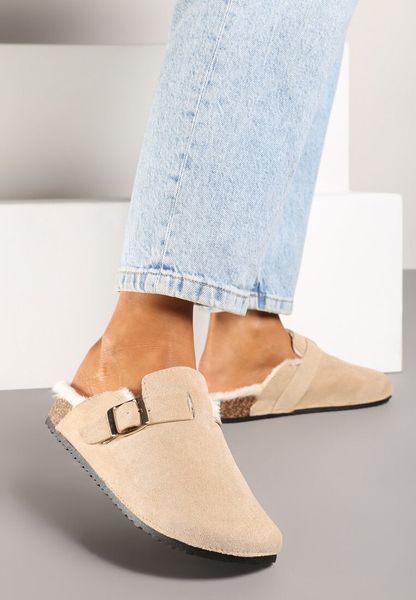 Beżowe Kapcie na Płaskiej Podeszwie Ozdobione Paskiem z Klamrą Ninnithra