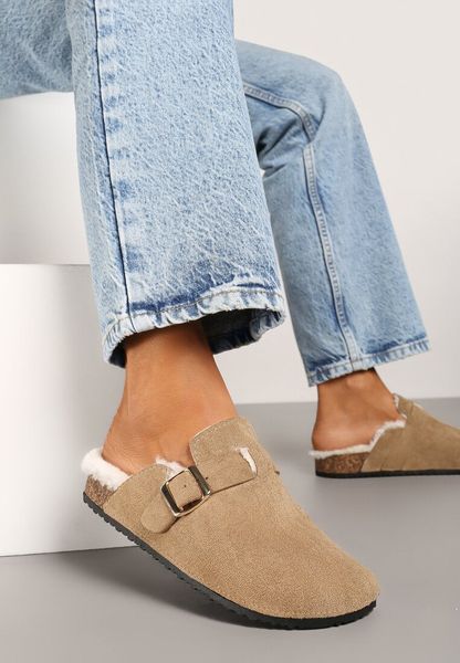 Ciemnobeżowe Kapcie na Płaskiej Podeszwie Ozdobione Paskiem z Klamrą Ninnithra