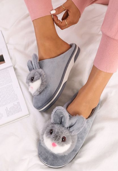 Kapcie Antinna na grubej, płaskiej podeszwie, wsuwane. Wykonane w całości z materiału włókienniczego typu welur. Z zakrytym noskiem, ozdobionym aplikacją 3d w kształcie króliczka. Noś je do ulubionych dresów, legginsów albo sportowego kompletu!