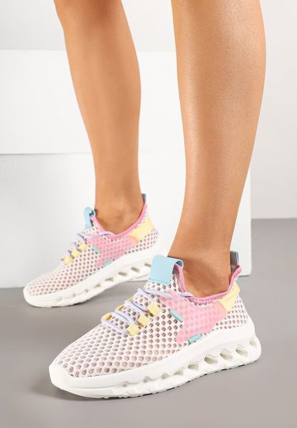 Biało-Różowe Sznurowane Buty Sportowe na Piankowej Podeszwie z Ozdobnym Detalem Atnarama