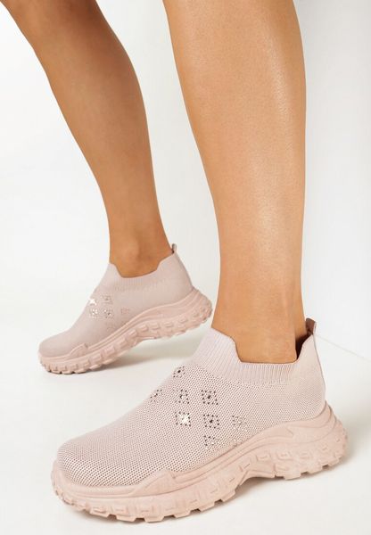 Beżowe Wsuwane Buty Sportowe z Cyrkoniami na Grubej Podeszwie Adisyna