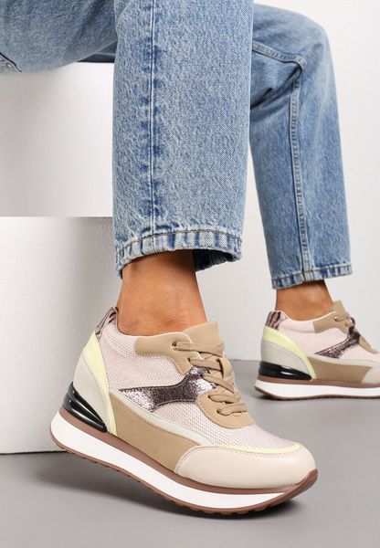 Beżowe Sneakersy na Ukrytym Niewysokim Koturnie z Brokatem Fioralan