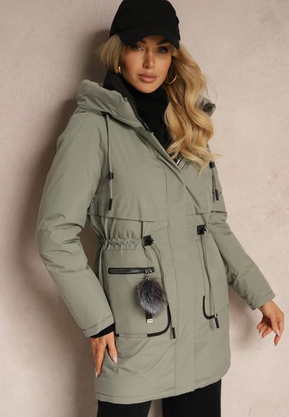Zielona Kurtka Parka ze Ściągaczami w Talii i Kapturem Zdobiona Zawieszką Zeriena
