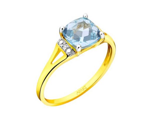 Pierścionek z żółtego złota z diamentami i topazem Sky Blue – próba 375 – 109.987. Żółte złoto rodowane