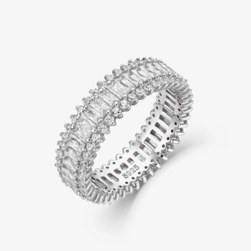 Pierścionek Mia to elegancka, trójrzędowa obrączka, ozdobiona przezroczystymi cyrkoniami w szlifie okrągłym i baguette. Idealny towarzysz na wyjątkowe wieczory – nadaje stylizacji nutę blasku i glamouru. Dzięki wyrafinowanemu kunsztowi wykonania i luksusowemu designowi pierścionek Mia to perfekcyjny dodatek dla każdej kobiety szukającej stylowej i eleganckiej biżuterii.