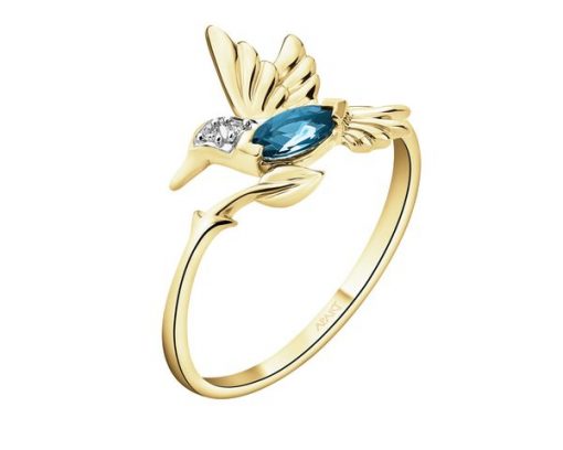 Pierścionek z żółtego złota z diamentami i topazem London Blue – koliber – próba 375