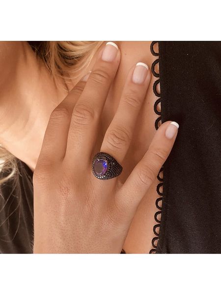 – materiał: srebro Sterling próby 925- powłoka: rodowanie- kamień 1: ametyst- kolor kamienia: fioletowy- kamień 2: spinel- kolor kamienia: czarnyWskazówka: Zdjęcie produktu w powiększeniu.