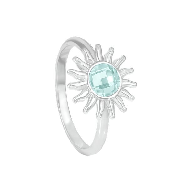 Pierścionek Soleil z niebieskim szkłem kryształowym, mały posrebrzany. Kolekcja Soleil została zainspirowana siłą słońca. Składa się z talizmanów, które symbolizują światło, optymizm i radość. Symbol słońca wzmacnia nas, dodaje nam siły i pozytywnej energii. Autorska biżuteria doskonale wpisuje się w wakacyjny mood. Wielkość: 1,2 cm Pierścionek wykonany jest z mosiądzu pokrytego srebrem próby 925.