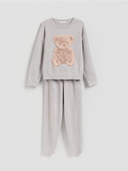Dwuczęściowa piżama o swobodnym kroju, wykonana z miękkiej, puszystej dzianiny.